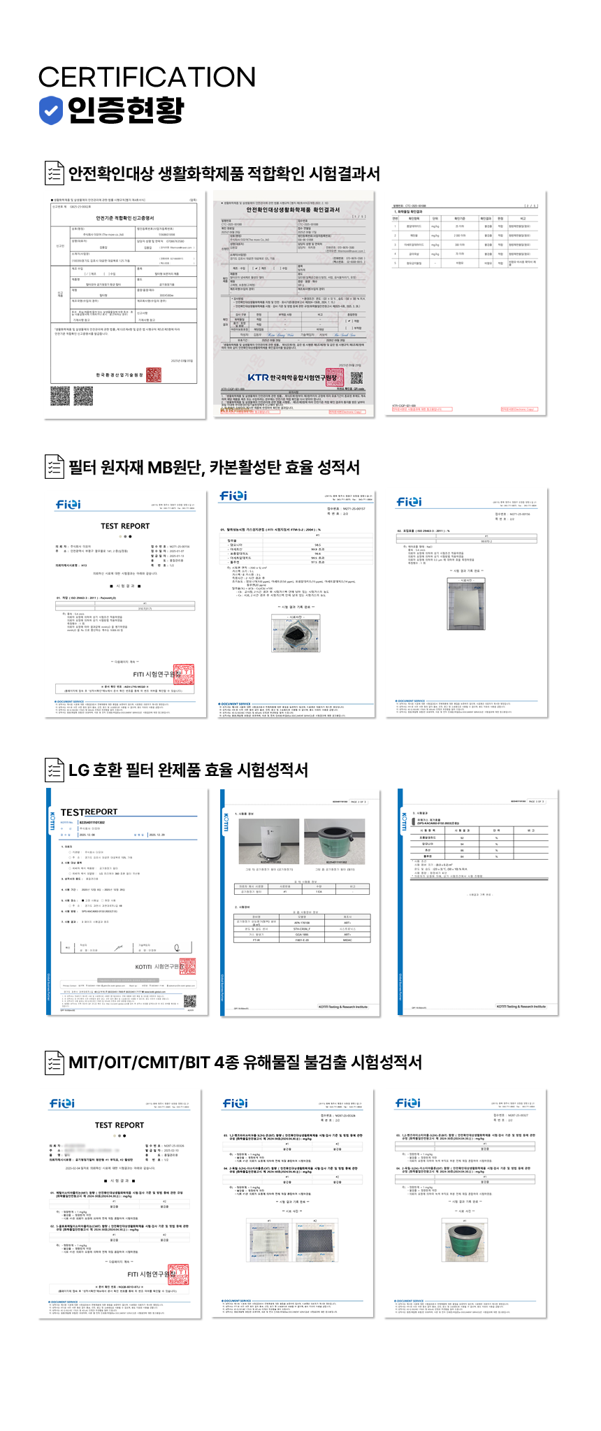 FITI 공인기관에 매년 필터 원자재 및 완제품에 대한 집진효율, 유해가스 차단율, OIT 검출여부 등 각종 시험을 진행합니다.