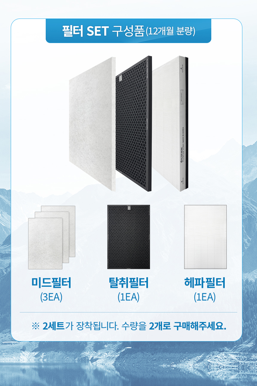 해당 공기청정기에는 필터가 2세트 장착됩니다. 전체교체를 위해 구매수량을 2개로 해주세요.